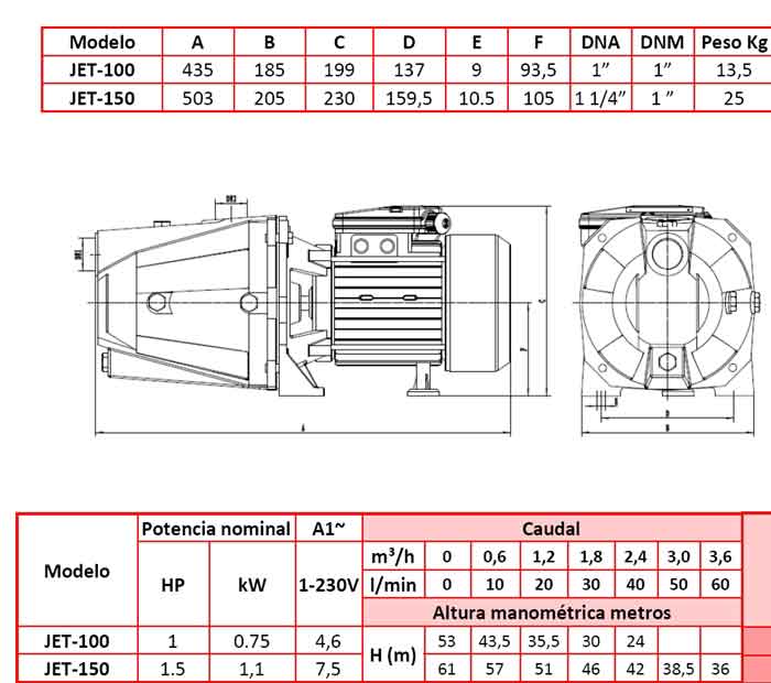 Bomba Centrífuga serie JET hasta 1,5 HP 80 l/min-60m.
