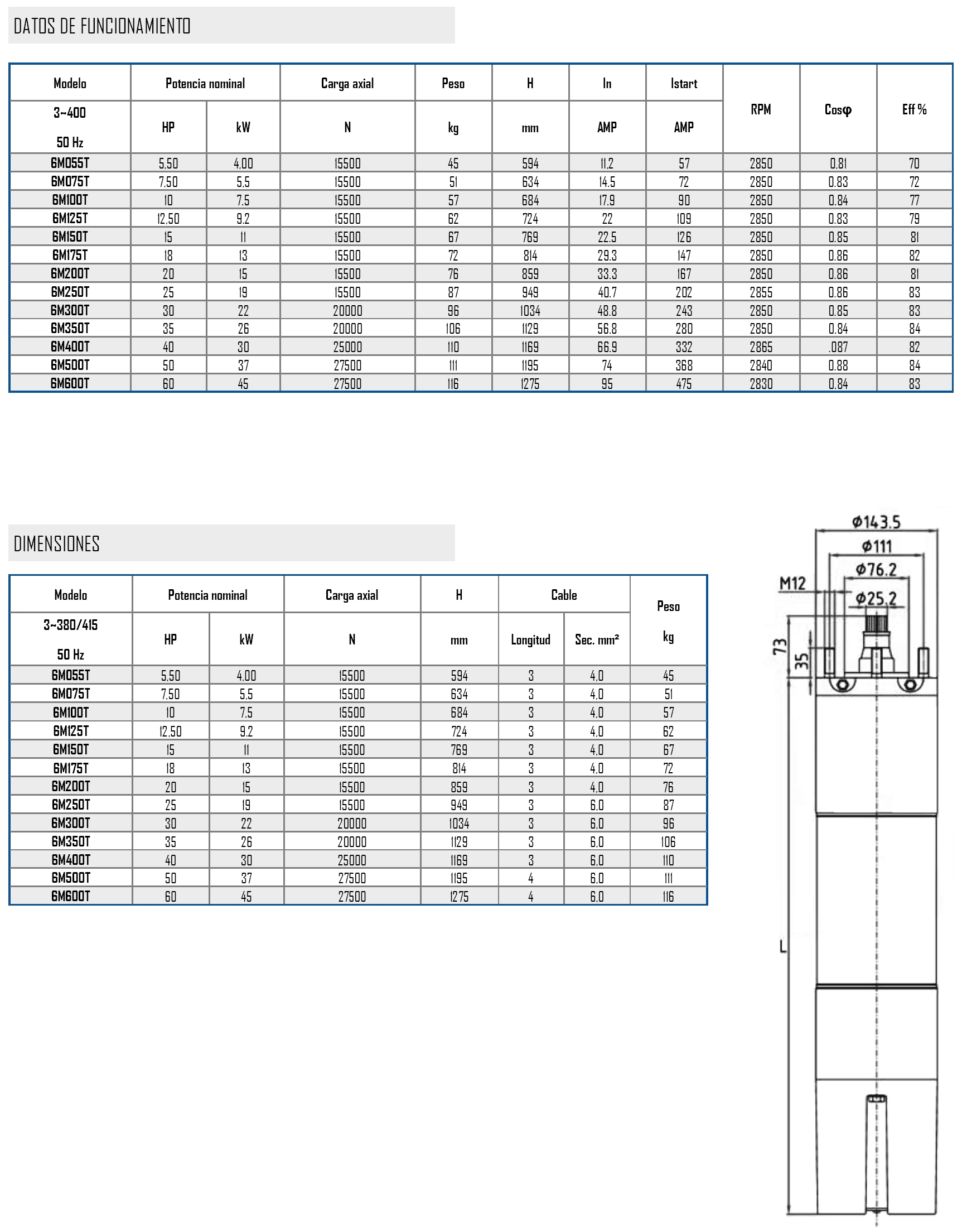 Motores sumergibles rebobinables 6 pulgadas P6 hasta 50 HP.