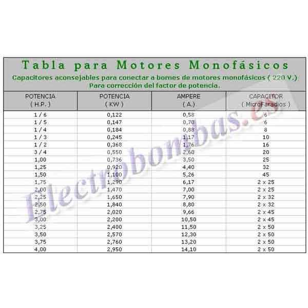 Condensador para motores monofásicos consulten nuestras tablas-seleccionen la capacidad adecuada.