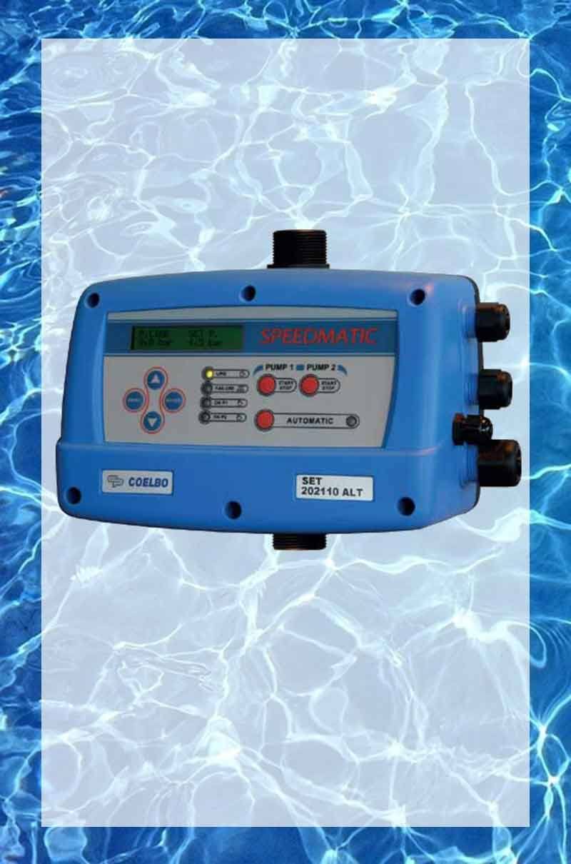 El SPEEDMATIC SET ALT es una aparato compacto para el control de grupos de presión de 2 bombas con sistema electrónico gestionado por un software que responde a las rigurosas exigencias de eficacia y seguridad de los más importantes constructores de bombas. Incluye un INVERTER (variador de frecuencia) para el control de la bomba principal regulando su velocidad para mantener constante y fija la presión óptima en la instalación, independientemente del caudal que el grupo está suministrando. Las bomba auxiliar está gestionada mediante un relé de potencia.